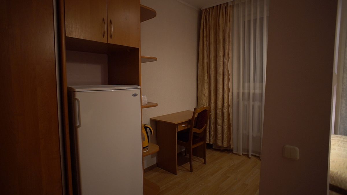 В номере: односпальная кровать, прикроватная тумба, стол, стулья, шкаф, кресло, телевизор, холодильник, электрочайник, утюг с гладильной доской, сушилка для белья, набор посуды