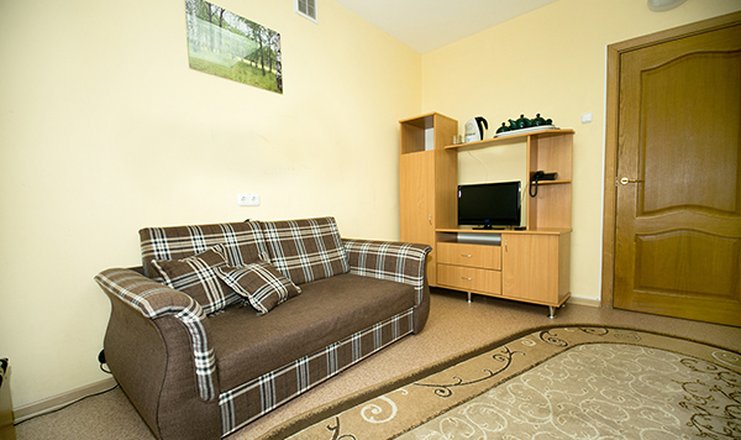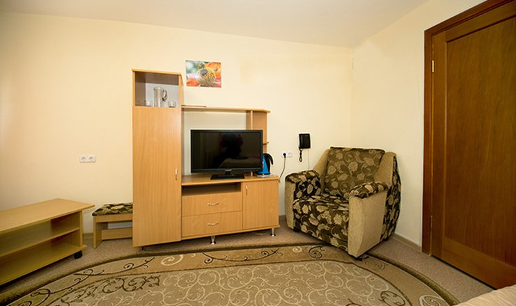 В номере: вешалка, диван раскладной, зеркало, кресло-кровать, кровать двуспальная, прикроватные тумбочки, столик журнальный, шкаф набор посуды, телевизор, холодильник, электрочайник,