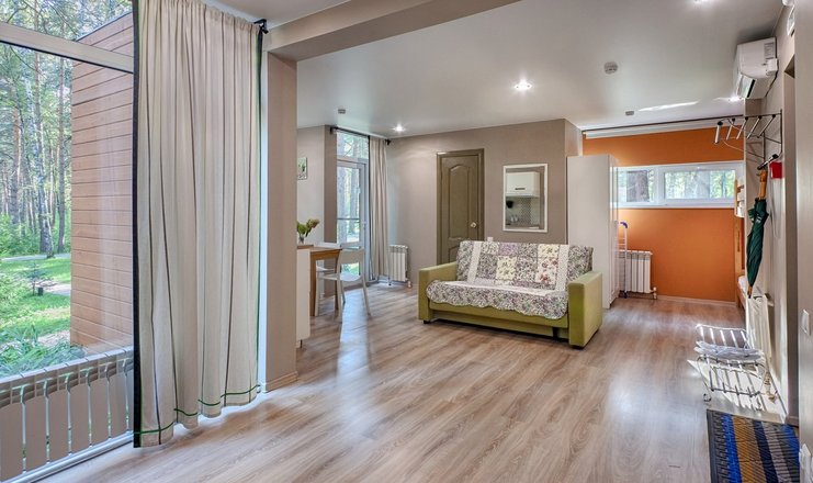 В номере: Кухня, вешалка, диван раскладной, зеркало, кровать 2-спальная, мягкая мебель, прикроватные тумбочки, стол, стулья, шкаф, кондиционер, микроволновка, мини-холодильник, набор посуды, плита электрическая, сейф, ТВ, телефон, чайный набор посуды, электрочайник